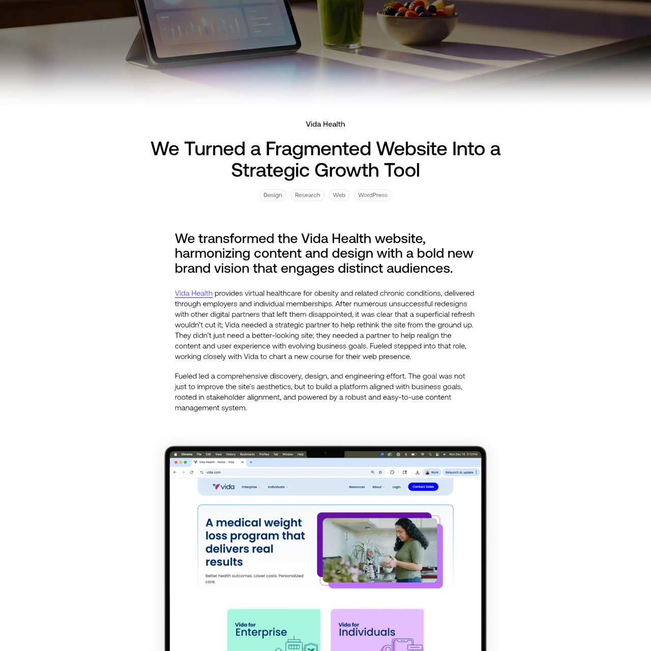 Fueled transformed Vida Health's website by realigning content and user experience with evolving business goals, addressing fragmented audiences of B2B clients and individual members. The project involved stakeholder alignment, a comprehensive discovery phase, and the implementation of a robust content management system to ensure a cohesive digital presence. Through this effort, Vida achieved a more engaging and strategically aligned web experience that effectively serves its target audiences. The result was a platform that not only improved aesthetics but also supported the company's broader objectives through a well-structured, user-centered design.