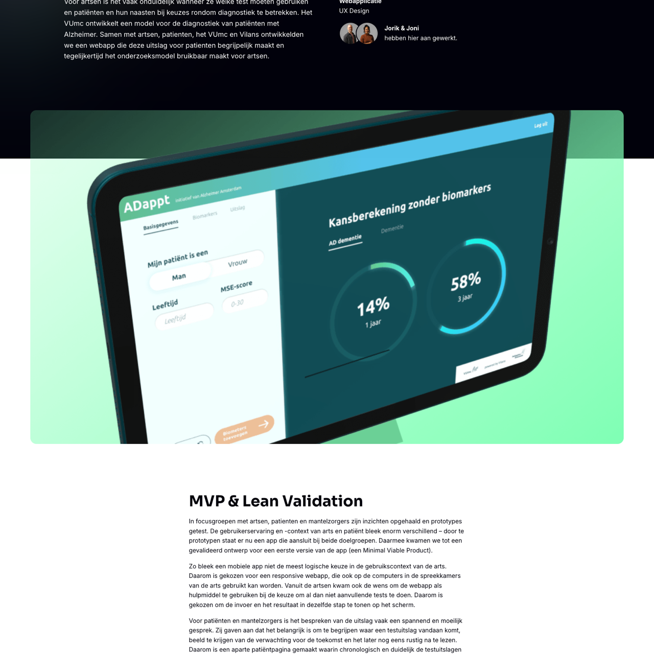 VUmc collaborated with doctors, patients, and Vilans to develop a web app that simplifies Alzheimer's diagnostic outcomes. The project focused on creating a responsive platform that bridges the gap between complex medical data and user-friendly interaction. Through MVP and lean validation, the team designed an app that aligns with both physician and patient needs, integrating input and results in a single step. The solution addresses the challenge of explaining diagnostic probabilities to patients and healthcare professionals, offering a clear, structured interface for understanding test results. The app's design emphasizes accessibility, with a dedicated patient page that chronologically displays test outcomes and allows for printability, enabling doctors to add personalized explanations. The outcome is a more intuitive and effective tool for managing Alzheimer's diagnosis and communication.