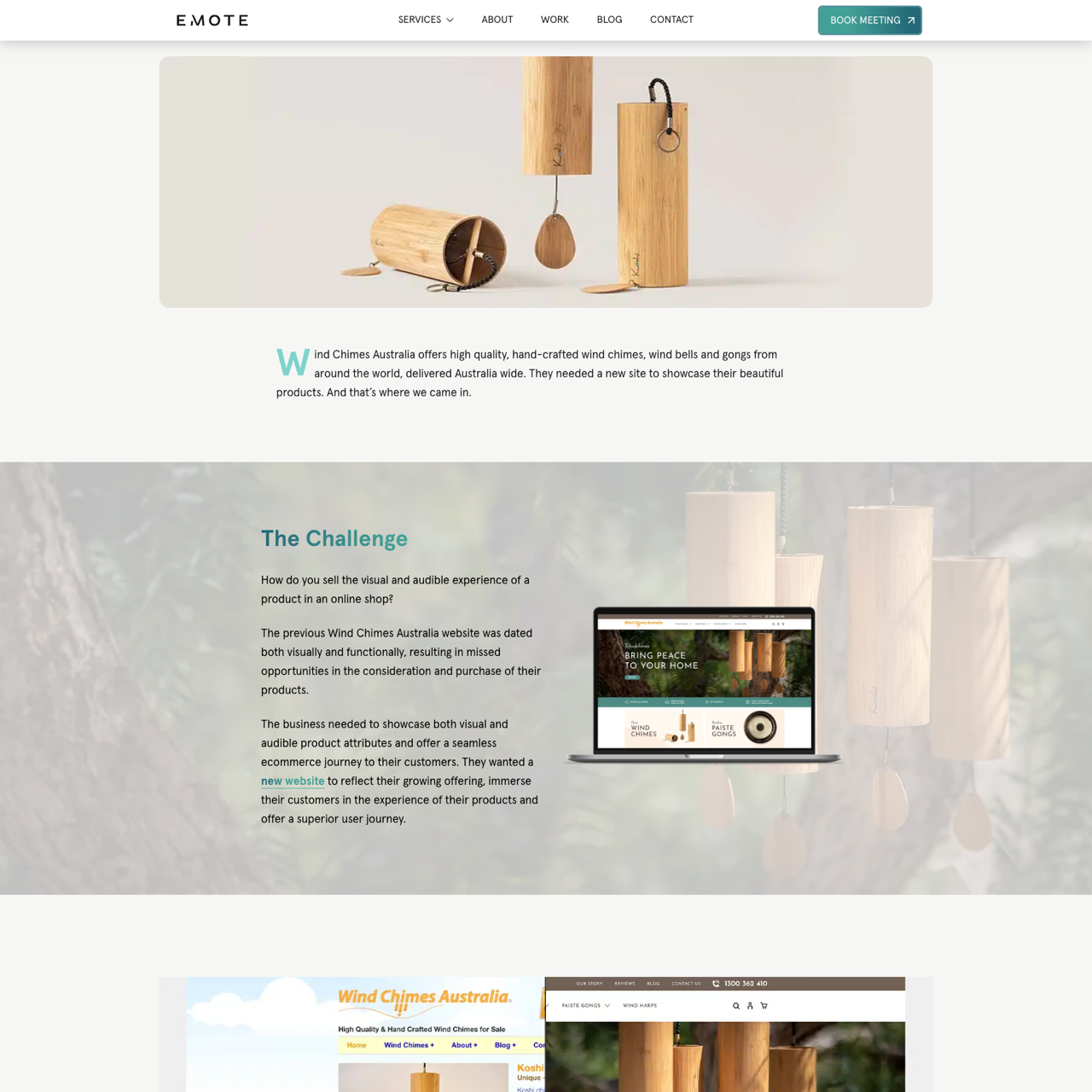 Wind Chimes Australia needed a modern website to showcase their hand-crafted wind chimes, bells, and gongs. Emote Digital designed a calming, earthy platform with audio playback and filters, enhancing the visual and auditory experience. The new site uses WooCommerce for seamless ecommerce, offering a responsive design across devices. The outcome included increased visitors and sales, reflecting the brand’s commitment to sustainability and aesthetic appeal. The platform’s efficient usability and scalability further supported the business’s growth.