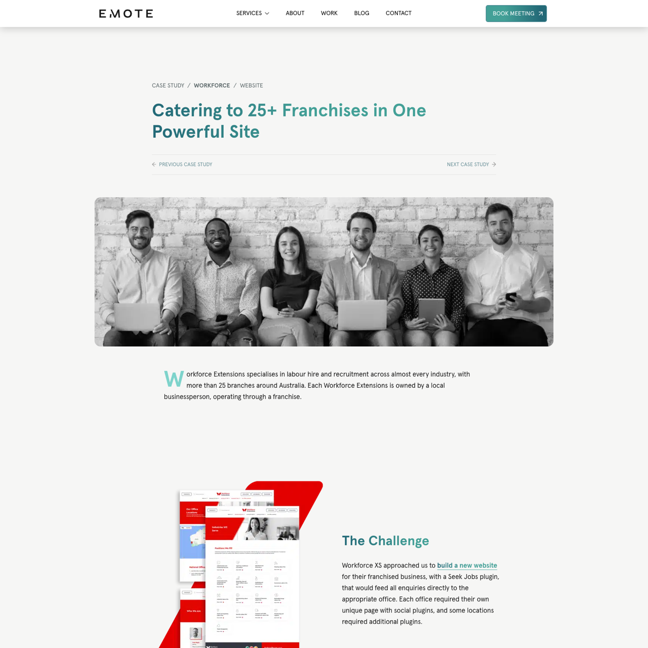 Workforce XS transformed their franchised business by creating a unified website with personalized plugins and functionality. The solution addressed the need for a single platform to handle 25+ locations, each requiring unique pages and plugins. Through a collaborative approach, Emote Digital designed a hero website with SEO, search capabilities, and individual form routing to specific offices. The result was a secure, efficient platform that reduced administrative burden and improved user experience for all franchisees. The site now seamlessly directs enquiries to the right office, enhancing accessibility and operational efficiency for the entire network.